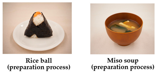Photos of the dishes used in Study 1 (left, rice balls; right, miso soup). Three labels (preparation process) were used: food name only (control), machine-made, or handmade.