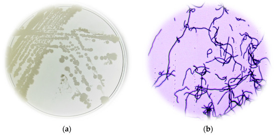 Soil samples were collected aseptically from Mount Karadzica in North Macedonia, 34 km from Skopje, the capital city. The samples were placed in sterile bags and stored at 4 °C for subsequent analysis. Isolation involved diluting the soil sample in a 0.9% saline solution and heating it to 70 °C for 30 min to enhance the growth of spore-forming bacteria. Serial dilutions of the sample were subsequently plated on nutrient agar (NA) plates and incubated at 37 °C overnight [8]. Qualitative analyses were conducted based on the morphological characteristics of Bacillus spp. [10,11].