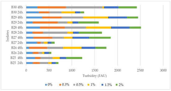 Probiotics need to withstand the acidic conditions of the stomach and effectively colonize the gastrointestinal tract [14]. After exposure to acidic conditions (pH 3.0), growth was observed for all seven selected isolates, indicating that the isolates have the capacity to grow at pH 3, i.e., tolerance to low pH values after the incubation period of 24 and 48 h. In addition, all seven isolates exhibited significantly high survival rates in 0.3–2% bile salt solutions (Figure 2).