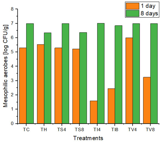 With respect to the E count, after 24 h of storage, the treatments TH, TS4, TS8, TI4, TV4 and TC displayed values close to 10³ CFU/g. Significant differences were observed between the TI8 and TV8 treatments in comparison with the TC treatment, reaching a difference of 1 log. After 8 days of storage, the TS4, TS8 and TC treatments presents results exceeding 10⁶ CFU/g, while the other treatments were below this value, with results of approximately 10⁵ CFU/g. TH treatment showed the lowest level, reaching 10⁴ CFU/g.