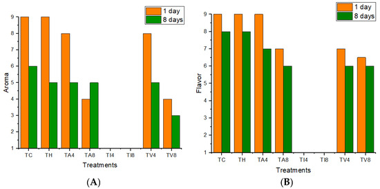 The aroma and flavor attributes are shown in Figure 2. When analyzing the evolution of the aroma, it was observed that, after 24 h, the immersion treatments for both REO concentrations presented values below the acceptability limit (<5) for both aroma and flavor, so they were discarded. The other REO treatments, except TS8 and TV8, showed initial scores between 8 and 9, indicating good initial acceptance, as observed in Figure 2A.