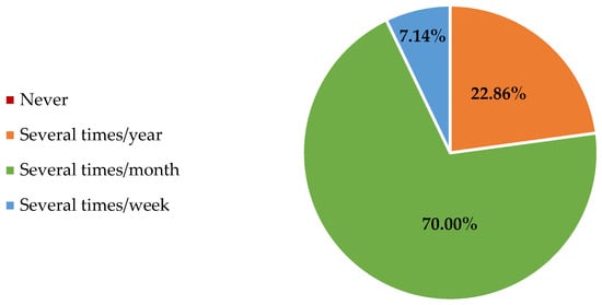 A total of 70 consumers participated in this sensory evaluation. Regarding the frequency of the consumption of burgers, 7.14% of the participants consumed these products weekly and 70% monthly, as shown in Figure 1.