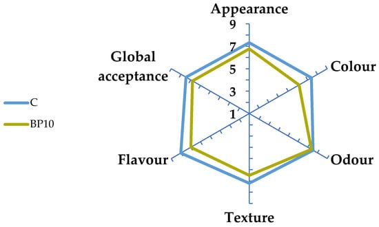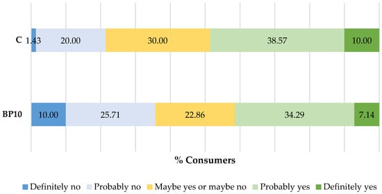 Regarding the results on consumers’ purchase intention (Figure 4), 48.57% and 41.43% of consumers stated that they would buy or probably buy sample C and BP10, respectively. Although there was a high percentage of negative responses (‘Definitely not’ or ‘Probably not’) for BP10 samples, no significant differences were found between both formulations (p > 0.05).