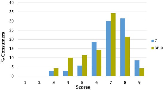 The percentages of the scores given by the consumers for the attribute global acceptance are shown in Figure 3. For both formulations C and BP10, a higher number of responses were clustered in scores 7 and 8.