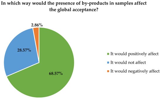 Finally, consumers were asked in which way the fact of using by-products in the burgers would affect the global acceptance of the product. Figure 5 shows how the highest percentage of participants stated that their perception of the product would improve, followed by consumers for whom the presence of by-products would not affect global acceptance. Only 2.9% of participants stated that the presence of by-products in the samples would negatively affect their global acceptance. According to these results, the presence of by-products could be considered an added value for most consumers in the study, demonstrating the potential of by-product utilisation for human consumption.