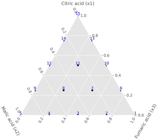 A 15-point augmented simplex-lattice mixture design to evaluate the effects of citric acid (x1), malic acid (x2), and fumaric acid (x3).