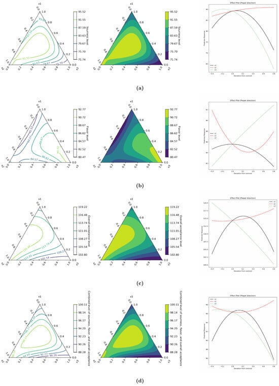 Figure 2 shows the contour and effect (Piepel direction) plots, which illustrate the relationships among the factors citric acid (x1), malic acid (x2), and fumaric acid (x3) concerning sourness level (Figure 2a), flavor level (Figure 2b), overall acceptance level (Figure 2c), and a combined metric of these attributes (Figure 2d). Figure 2d aggregates the sourness, flavor, and overall acceptance levels results, aiming to find the best mix of x1, x2, and x3 to maximize the overall sensory qualities of the gummies. Together, these plots provide a comprehensive analysis for optimizing product formulation to achieve a balanced sensory profile.
