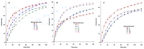 Fitted drainage volume curves of pulque foam prepared with a ratio 1:1 (A), 1:2 (B), and 2:1 (C) LEW:P at different mixing times.