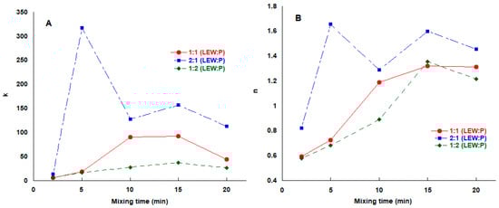 Values of k (A) and n (B) obtained for pulque foams prepared with different LEW:P ratios at different mixing times.