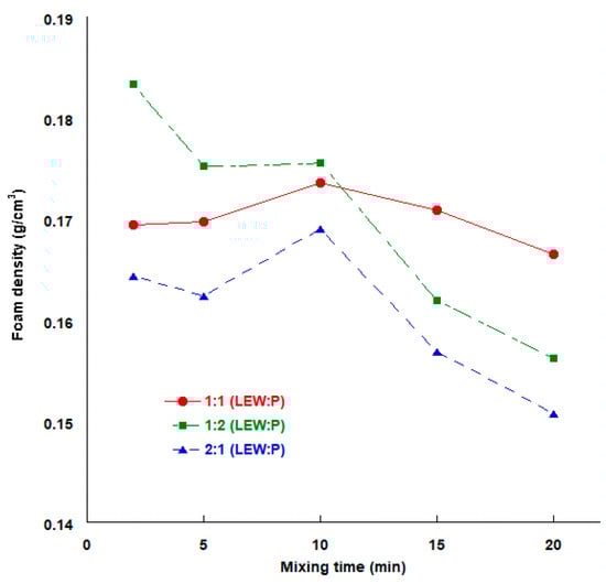 In this work, when compared with the other treatments, in the 2:1 (LEW:P) foam formed using a mixing time of 20 min, a low volume of liquid drained was observed (38 mL) and the lowest foam density was obtained (0.152 g/cm3), so an optimal foam structure can be produced for further processing.