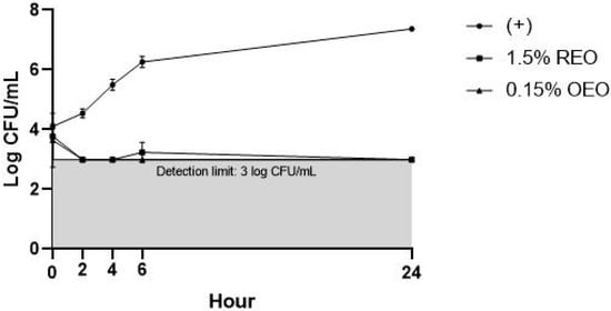 Both individual treatments of rosemary essential oil (REO) and oregano essential oil (OEO) resulted in a growth of <3 log CFU/mL starting at hour 2, with minute survival at hour 6 from the treatment with 1.5% REO. The growth of the microorganisms can be seen in Figure 1.