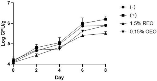 Slowed growth was observed from microorganisms obtained from treated chicken breast samples. After the eight-day growth period, samples treated with 1.5% REO resulted in a 0.69 log reduction compared to the positive control, while samples treated with 0.15% OEO resulted in a 0.31 log reduction (p < 0.05) (Table 1). The growth of the microorganisms throughout the 8-day period can be seen in Figure 2.
