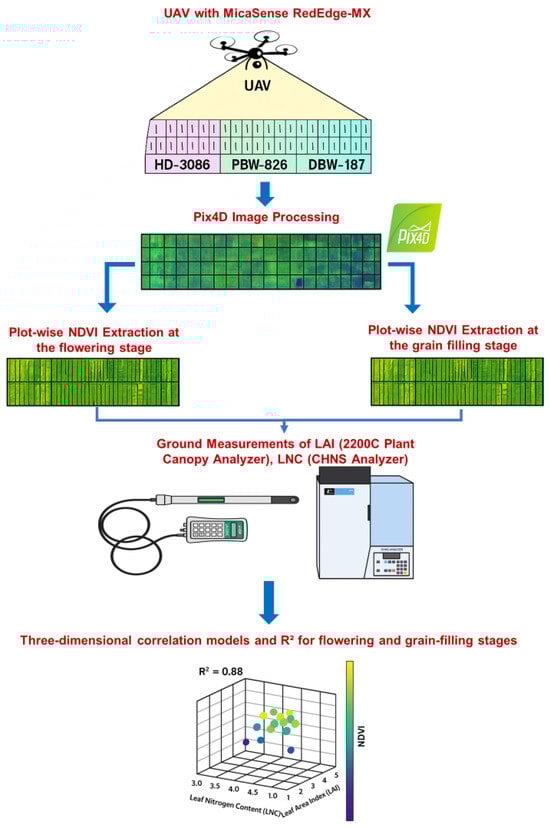 Wheat varieties differ in their genetic potential, canopy architecture, and nutrient uptake efficiency, which influence their physiological responses to nitrogen application and remote-sensing metrics like the NDVI. Therefore, it is essential to assess multiple varieties to ensure the robustness and scalability of drone-based monitoring approaches across diverse genotypes. This study investigated the relationships between the NDVI, LAI, and LNC during key growth stages of wheat, focusing on three wheat varieties (DBW-187, HD-3086, PBW-826) under varying nitrogen treatments. By evaluating the relationships, this study aimed to demonstrate the efficacy of drone-assisted crop monitoring in precision agriculture. Building on previous studies [7,8,9,10], this work aimed to provide valuable insights for precision agriculture applications and contribute to improving the resource use efficiency.