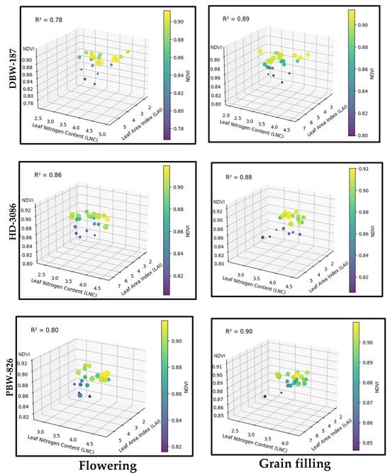 A similar trend was observed for the NDVI and LNC correlations, which strengthened from the flowering to grain-filling stages. At flowering, the R2 values were 0.76, 0.84, and 0.79 for DBW-187, HD-3086, and PBW-826, respectively. These correlations increased to 0.87, 0.89, and 0.91 during the grain-filling stage. The higher sensitivity of the NDVI to the LNC at this stage is likely due to nitrogen accumulation in the leaves, enhancing their spectral reflectance in the near-infrared region. These results highlight the NDVI as a reliable proxy for monitoring the nitrogen content, particularly during critical growth stages.