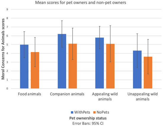 Graph showing moral concerns scores for different categories of animals between participants (pet owners vs. non-pet owners in childhood).
