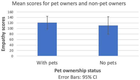 As shown in Figure 3, the mean score of animal empathy for the pet owner group (M = 121.65, SD = 22.83) was higher than the mean score for the non-pet owner group (M = 111.25, SD = 31.49). However, an independent sample t-test did not indicate any significant difference in these findings, t(70) = 1.55, p > 0.05, with a small to moderate effect size (Cohen’s d = 0.41).