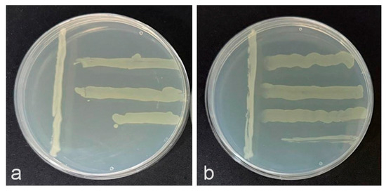 Ten bacterial isolates were tested for their in vitro antagonistic activity against the reference strains, according to [5]. Assays were carried out by plating streaks of suspensions of each of the bacterial isolates at 108 CFU/mL, and incubated at 28 °C for 48 h. Then, perpendicular streaks of suspensions of the X. vesicatoria reference strains at 107 CFU/mL were added and incubated under the same conditions. Ability to inhibit the growth of the pathogen by each of the isolates was determined by measuring the distance between streaks. Chloroform was additionally applied to look for activity due to the presence of diffusible compounds. All assays were performed in duplicate and repeated in an independent experiment.