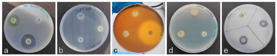 Exoenzyme production and nitrogen fixation assays. The environmental bacterial isolates with inhibitory activity against X. vesicatoria were additionally plated on different culture media to detect: (a) proteolytic, (b) lipolytic, (c) amylolytic, (d) DNase activities, and (e) nitrogen fixation. Plates display examples of positive results. The presence of either transparent or translucent halos surrounding the colonies was correlated with positive activity in (a–d), whereas the presence of opaque zones around the colonies and the ability to grow were correlated, respectively, with the activities in (b,e).