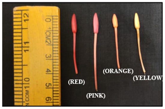 It was observed that the maximum flower bud length, flower bud width, and corolla tube length were recorded in the treatment combination of (V2 × T4) i.e., Pink (V2) with foliar spray of NPK + FeSO4 (0.5%) + ZnSO4 (0.5%) + Boric acid (0.2%). The increase in flowering attributes might be due to the beneficial role of zinc and iron in enhancing the translocation of carbohydrates, minerals, water, and amino acids from the site of synthesis to the various plant parts, including flowers, which in turn aids in increasing the number, size, and weight of flowers [,]. The application of FeSO4 and ZnSO4 enhanced vegetative growth, leading to the production of more food material which in turn is utilized for better development of flowers of annual chrysanthemum [,]. The results of the present study are also in close conformity with the findings obtained from gladiolus and marigold [,].
