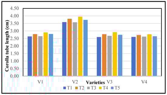Among the four varieties, Pink (V2) showed the maximum mean corolla tube length (3.73 cm). Of the five micronutrient combinations, foliar spraying of 0.5% ZnSO4 + 0.5% FeSO4 + 0.2% boric acid resulted in the highest mean corolla tube length (3.13 cm). The treatment combination of (V2 × T4) i.e., Pink (V2) with foliar spray of NPK + FeSO4 (0.5%) + ZnSO4 (0.5%) + Boric acid (0.2%), resulted in the maximum corolla tube length (3.95 cm) (Figure 2).
