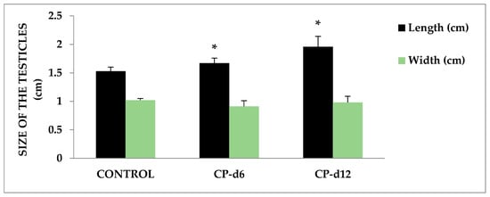 The results obtained (testicular length and width) were expressed as mean ± SEM. One-way ANOVA followed by Tukey’s post hoc test were performed using IBM SPSS Statistics 23.0 (IBM Corp., New York, NY, USA). The significance degree was set at p ≤ 0.05 (*).