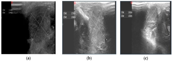 Appearance and measurement of testis: (a) CONTROL testis ((C): 1.12/0.94 cm.); (b) cisplatin-treated testis d6 ((CP-d6): 1.55/1.06 cm); (c) cisplatin-treated testis d12 ((CP-d12): 1.62/1.03 cm). The ultrasonographic images were obtained in a longitudinal scanning plane.