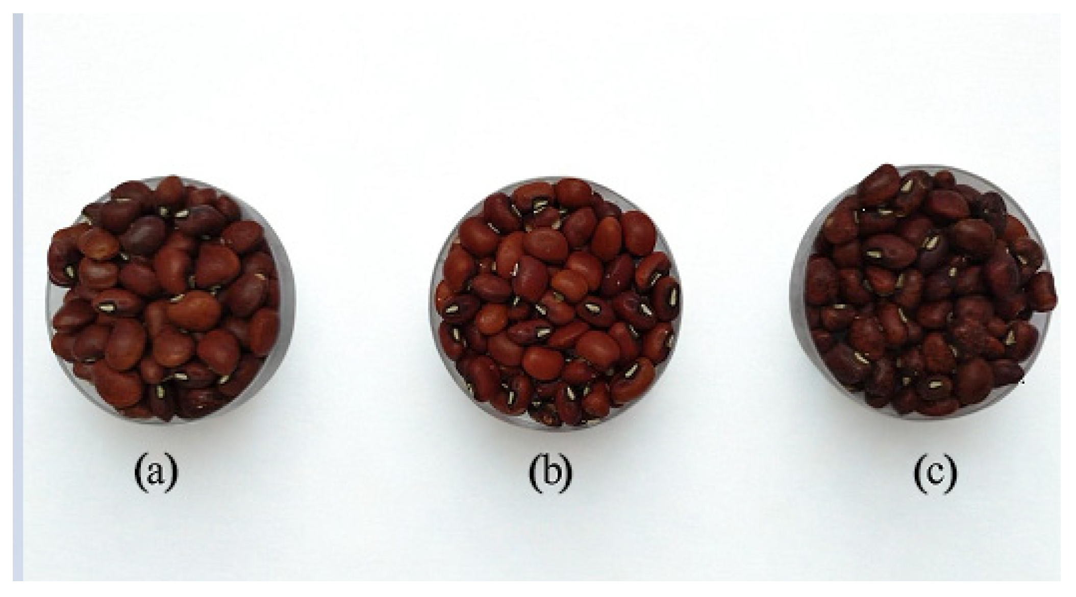Three varieties of creole beans were selected from the Faculty of Agricultural Sciences of the National University of Asuncion. The origin (georeferenced sampling location) is detailed below: 26°22′46.8″ S 56°24′42.9″ W (San Francisco), 26°10′07.0″ S 55°58′35.4″ W (speckled), and 26°10′26.3″ S 56°05′24.7″ W (Japanese cream). The samples were stored in an airtight container in a cool, dry place until analysis. The studied varieties are shown in