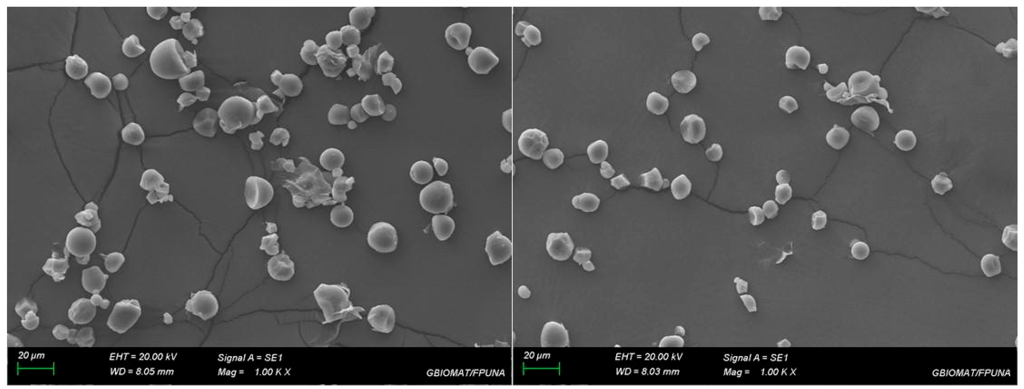 - Sívoli, L.; Pérez, E.; Rodríguez, P. Análisis estructural del almidón nativo de yuca (Manihot esculenta C.) empleando técnicas morfométricas, químicas, térmicas y reológicas. Rev. Fac. Agron. Univ. Cent. Venez. 2012, 29, 293–313. [Google Scholar]
