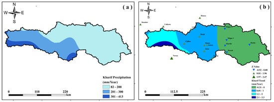 (a) shows the Kharif precipitation range and (b) shows the Kharif trend in precipitation.