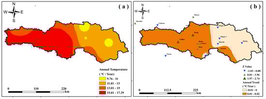 The annual average temperature of the study area, as per the results, was 14.40 °C (Figure 5a). Mann–Kendall results indicated a decreasing annual trend of temperature in the North–East region, adding to Burzil and Ushkore, they also showed a decreasing trend, but not significantly, while the remaining stations showed an increasing trend in the area (Figure 5b). The only stations that showed a significantly increasing trend were Bunji, Chillas, and Hunza, with Z (2.55, 2.74, and 2.74, respectively), with a rate of 0.2 °C/decade for each station.
