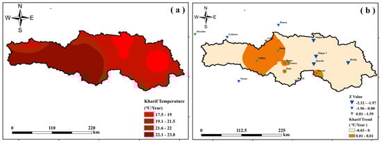 (a) shows the Kharif temperature range and (b) shows the Kharif trend in temperature.