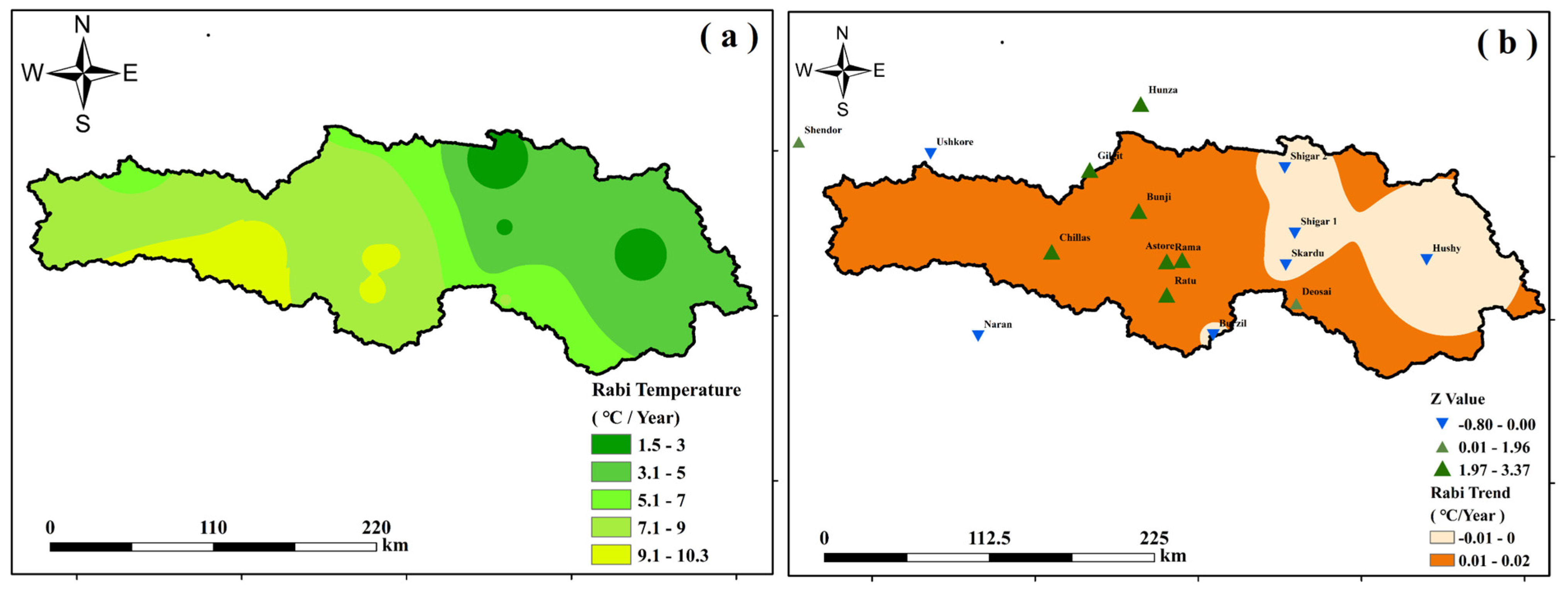 - Overall, the precipitation trend was increasing in the annual (Z = 0.063, Q = 0.055) and Kharif (Z = 1.319, Q = 0.652) time span, while decreasing in the Rabi season (Z = −1.34, Q = −1.158). Temperature was increasing in the annual (Z = 0.900, Q = 0.005) and Rabi (Z = 1.465, Q = 0.009) season, while decreasing in the Kharif season (Z = −0.502, Q = −0.004).