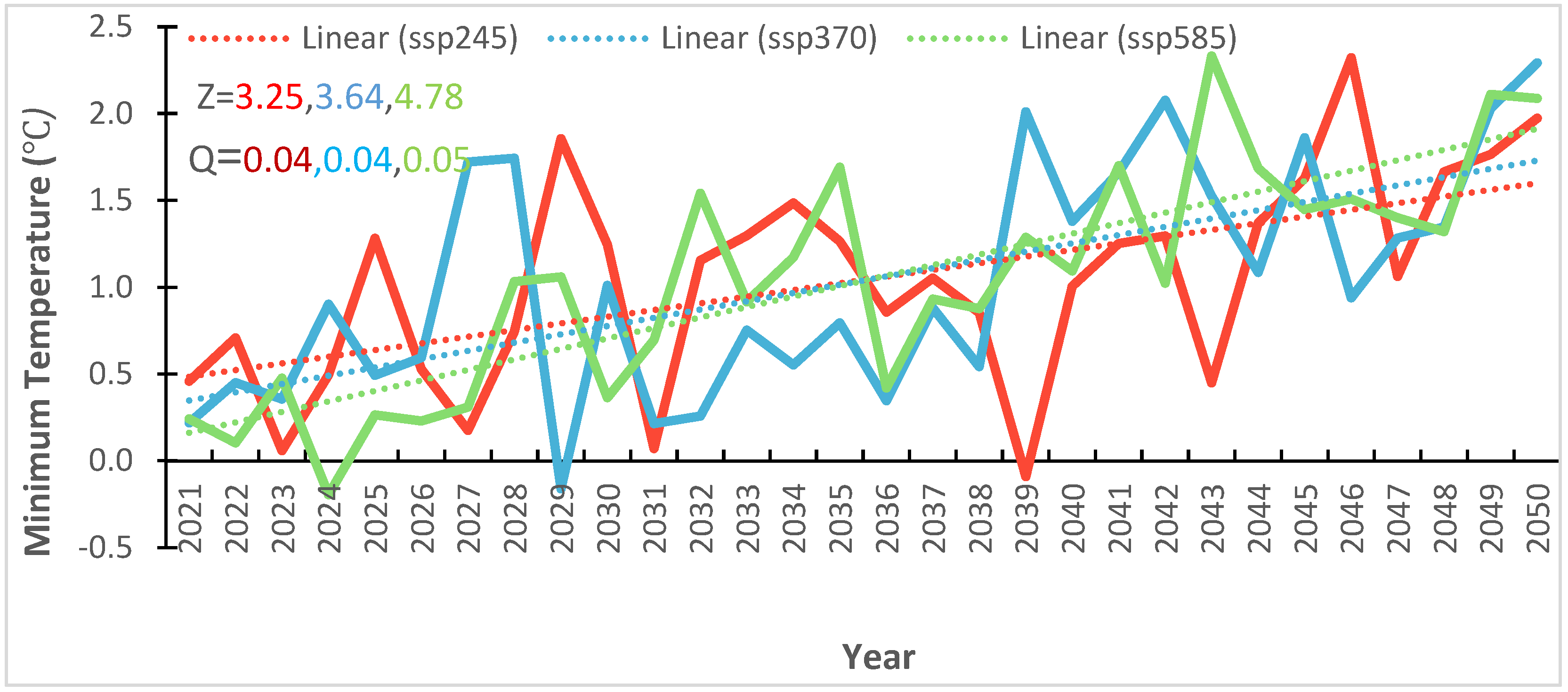 3.3. Linear Trend of Tmin Under SSP 2-4.5, 3-7.0 and 5-8.5 (2021-2050)