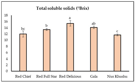 The results exhibited that there was a significant difference in total soluble solids (TSS) among the apple genotypes, as depicted in Figure 1. The highest TSS (15.4 °Brix) was observed in “Red Delicious”, followed by “Gala” (14.1 °Brix), “Red Full Star” (13.4 °Brix), and “Red Chief” (12 °Brix), while the lowest TSS (11.7 °Brix) was observed in “Nus Khushu” (Figure 1).