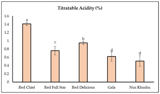 The results revealed that there was a significant difference in titratable acidity (TA) among the apple genotypes, as shown in Figure 2. The maximum TA (1.408%) was recorded in the cultivar “Red Chief”, followed by “Red Delicious” (0.95%), “Red Full Star” (0.76%), and “Gala” (0.62%), while the minimum TA was recorded in the cultivar “Nus Khushu” (0.48%) (Figure 2).