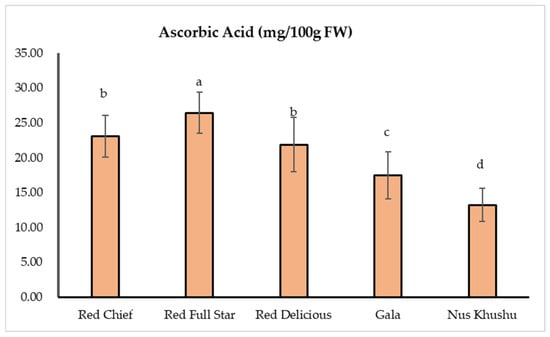 The results revealed that there was a significant variation in ascorbic acid among the assessed apple genotypes, as shown in Figure 3. The highest ascorbic acid was exhibited in Red Full Star (26.45 mg/100 g FW), followed by genotypes “Red Chief” (23.10 mg/100 g FW), “Red Delicious” (21.87 mg/100 g FW), and “Gala” (17.44 mg/100 g FW), while “Nus Khushu” showed the minimum ascorbic content (13.20 mg/100 g FW).