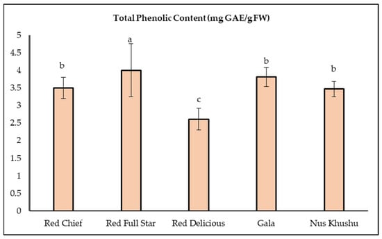 The results revealed significant varietal diversity in total phenolic content, as illustrated in Figure 4. The maximum TPC was recorded in the cultivar “Red Full Star” (4 mg GAE/g FW), followed by “Gala” (3.81 mg GAE/g FW), “Red Chief” (3.5 mg GAE/g FW), and “Nus Khushu” (3.47 mg GAE/g FW), while the minimum TPC was observed in “Red Delicious” (3 mg GAE/g FW).
