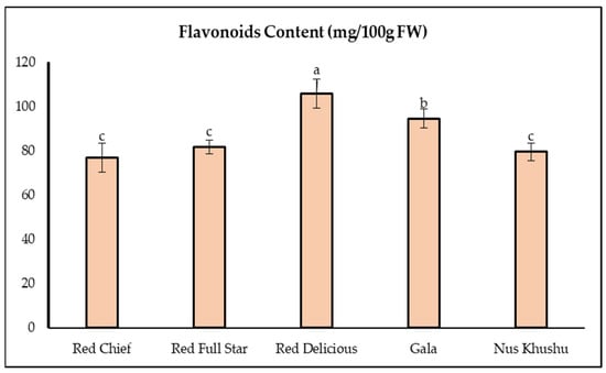 The results exhibit significant variation in flavonoid content among apple genotypes, as shown in Figure 5. The maximum flavonoid content was observed in “Red Delicious” (105.75 mg/100 g FW), followed by “Gala” (94.5 mg/100 g FW), “Red Full Star” (81.68 mg/100 g FW), and “Nus Khushu” (79.45 mg/100 g FW), while the minimum flavonoid content was recorded in “Red Chief” (76.75 mg/100 g FW).