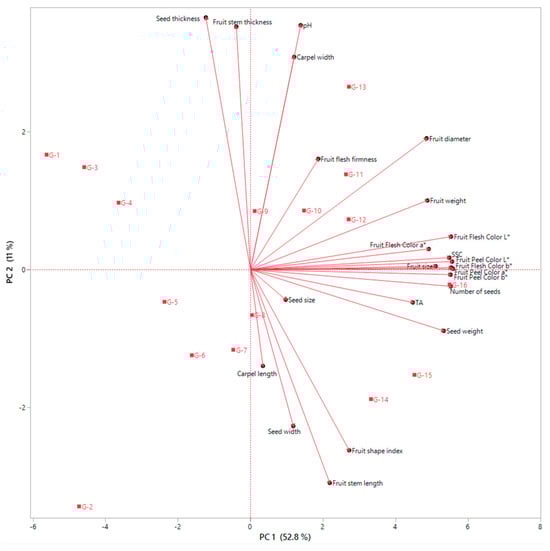 Principal Component Analysis (PCA) Biplot Graph of 16 Wild Pear Genotypes: Distribution of Genotypes and Phenotypic Traits on the PC1 and PC2 Axes (Traits related to fruit quality are positively associated with PC1). The red dots represent the 16 pear genotypes studied.