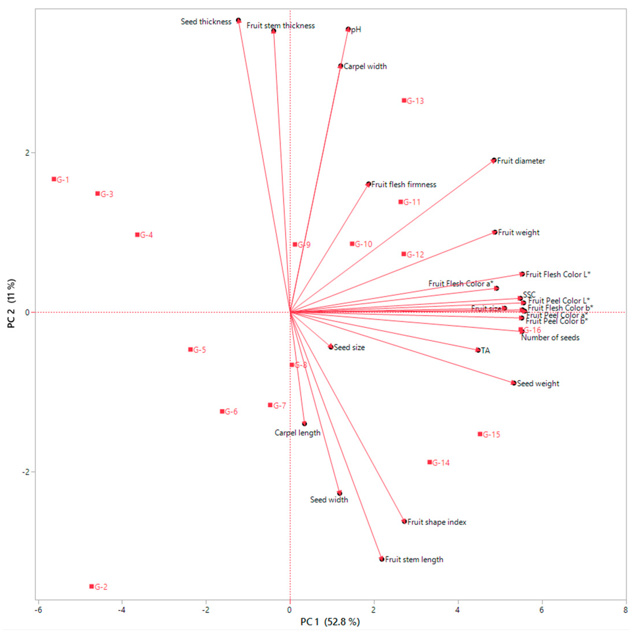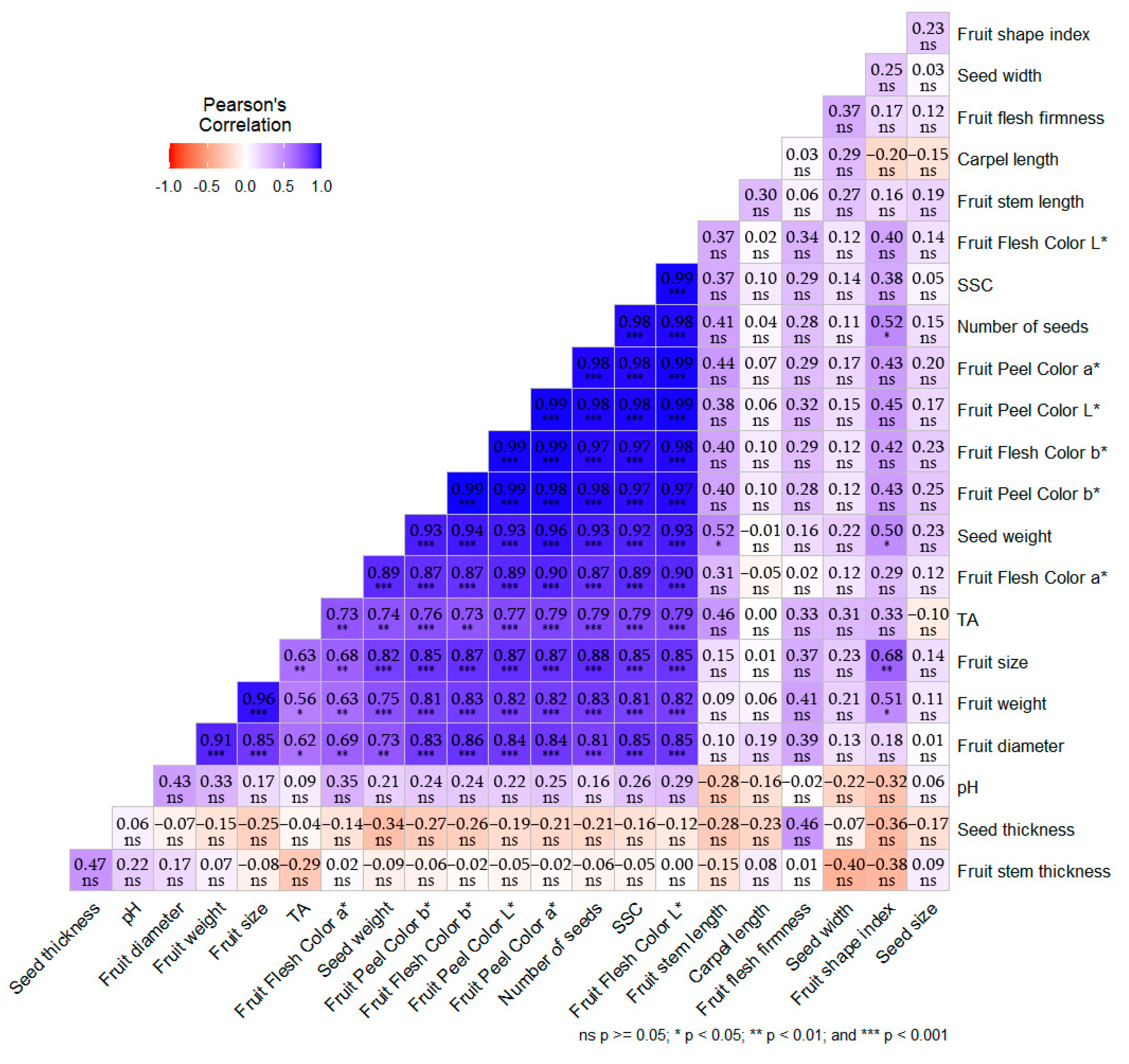| Fruit Flesh Color L* | 0.28 | 0.05 | −0.04 | 0.03 | 0.01 | −0.10 |
