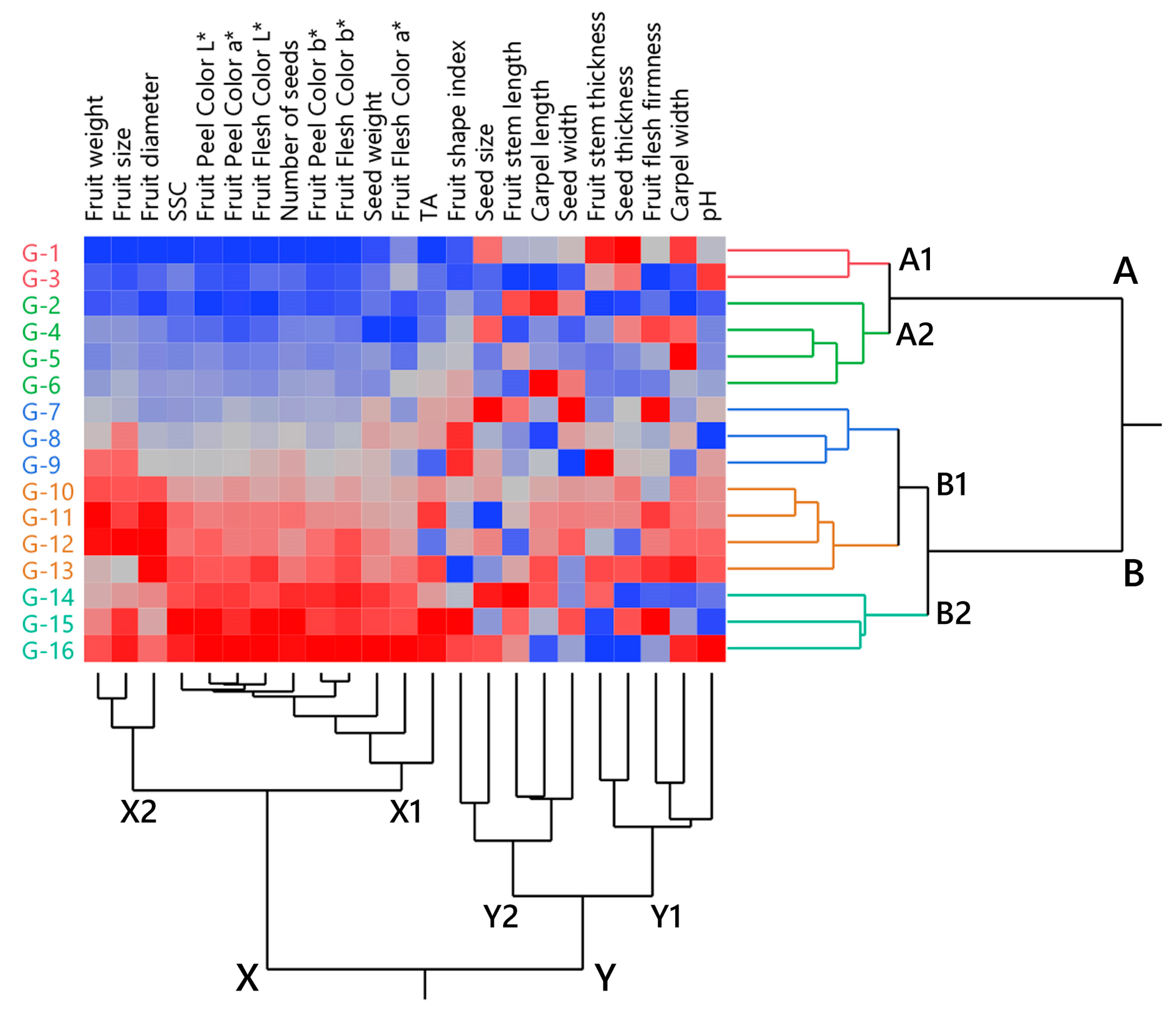 | Fruit Flesh Color a* | 0.25 | 0.03 | −0.19 | 0.03 | −0.06 | −0.20 |