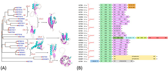 (A) DALI dendrogram generated from the structures of the KCTD C-terminal domains. Shown are representative three-dimensional models of the folded domains in the C-terminal region. (B) Schematic diagram of the KCTD protein domain organization. Cluster numbers are indicated in red. The standard BTB domains are in green. The domains of the C-terminal regions that follow the BTB are displayed in different colors. The figures are taken from ref. [17].