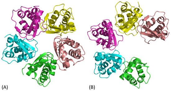 Crystal structures of the pentameric KCTD1 BTB domain are shown in cartoon representation: (A) closed conformation (PDB ID: 5BXB) and (B) open conformation (PDB ID: 5BXD). Each chain is differently colored for clarity.