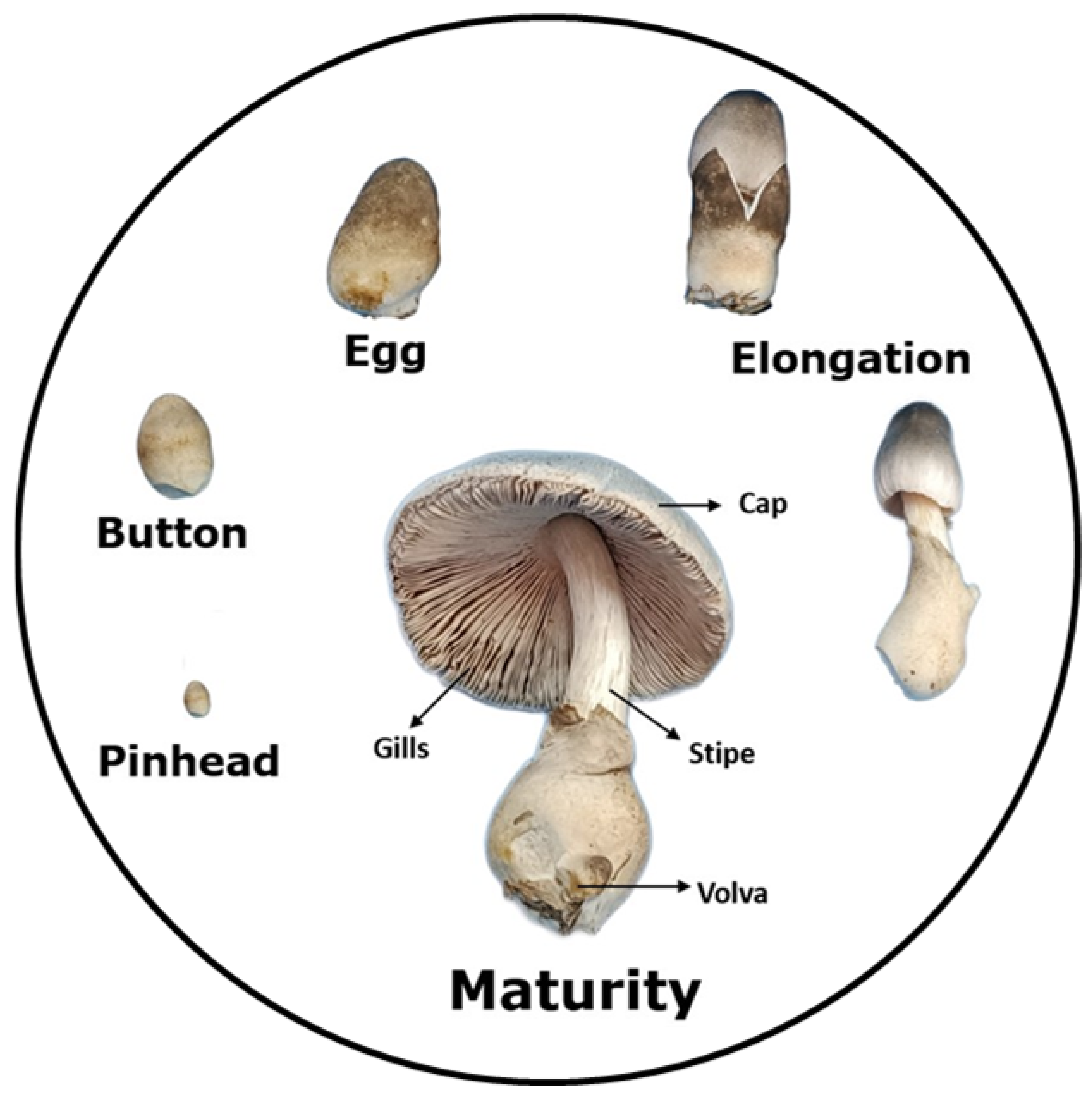 - Luu, T.T.H.; Bui, D.K.; Huynh, N.; Le, T.L.; Green, I.D. Effect of the Cultivation Technology on the Yield of Paddy Straw Mushroom (Volvariella volvacea). Korean J. Mycol. 2022, 50, 161–171. [Google Scholar] [CrossRef]