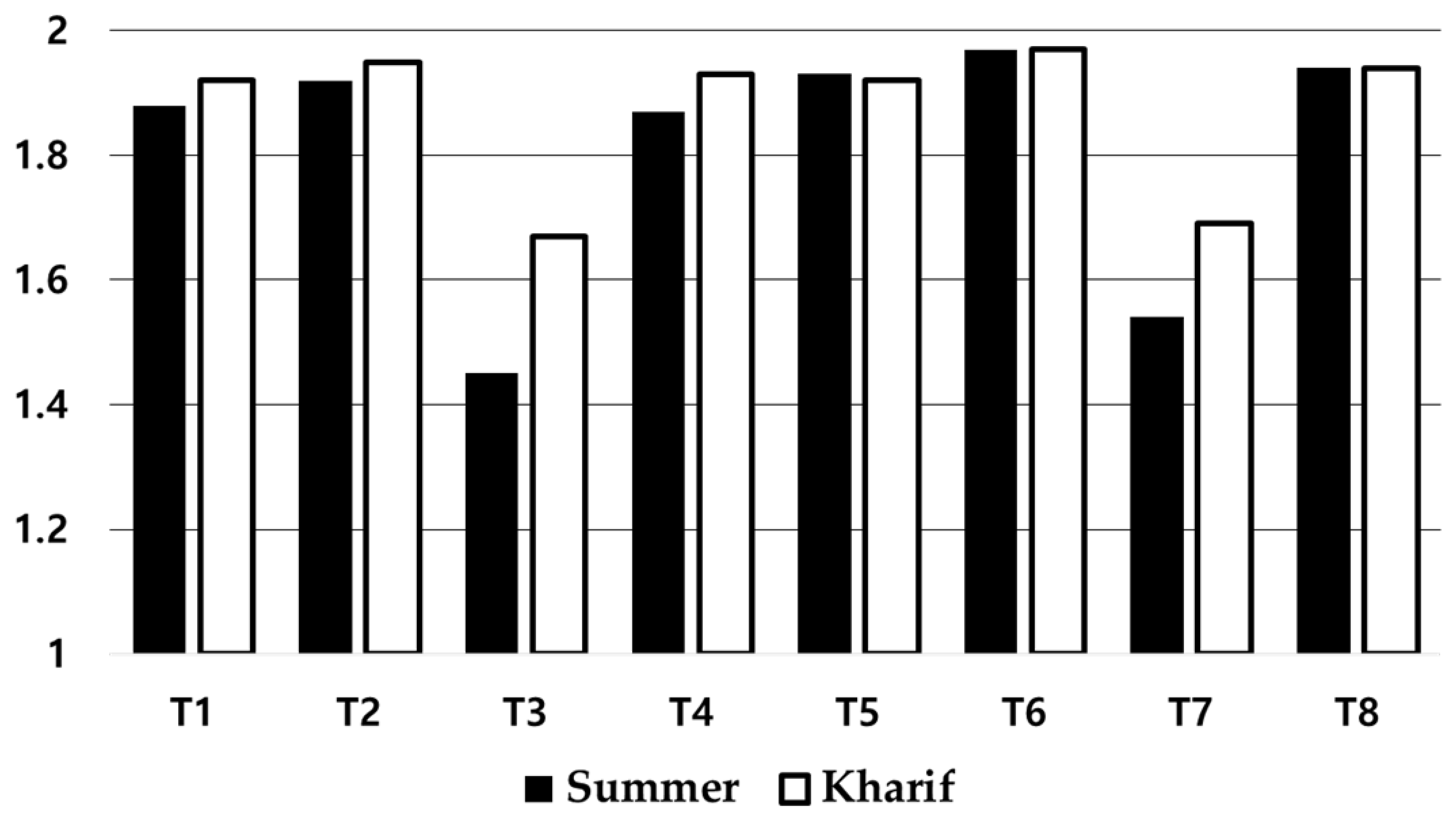 | T7 | T3 + Mulching | 29.4 | 25.4 | 74.5 | 79.4 |