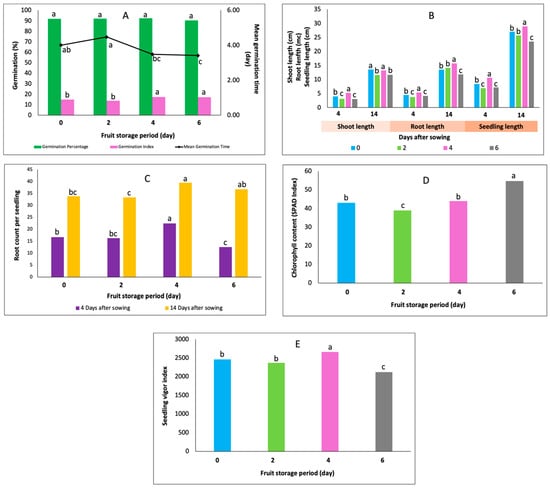 (A) The germination, germination index, mean germination time, (B) shoot, root, and seedling lengths, (C) root count per seedling, (D) chlorophyll content, (E) seedling vigor index of bitter gourd after fruit storage. Blue, green, pink, and gray bars indicate 0, 2, 4, and 6 days of fruit storage, respectively. Bars with different lowercase letters indicate a significant difference among fruit storage periods.