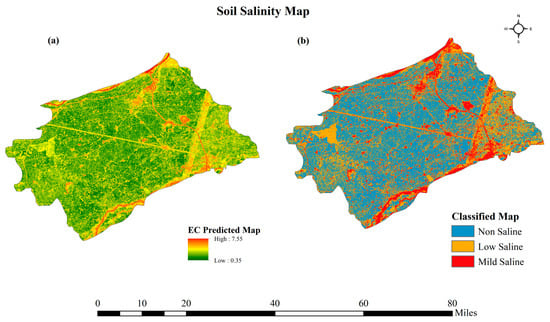 Soil salinity map: (a) EC predicted map and (b) classified map.