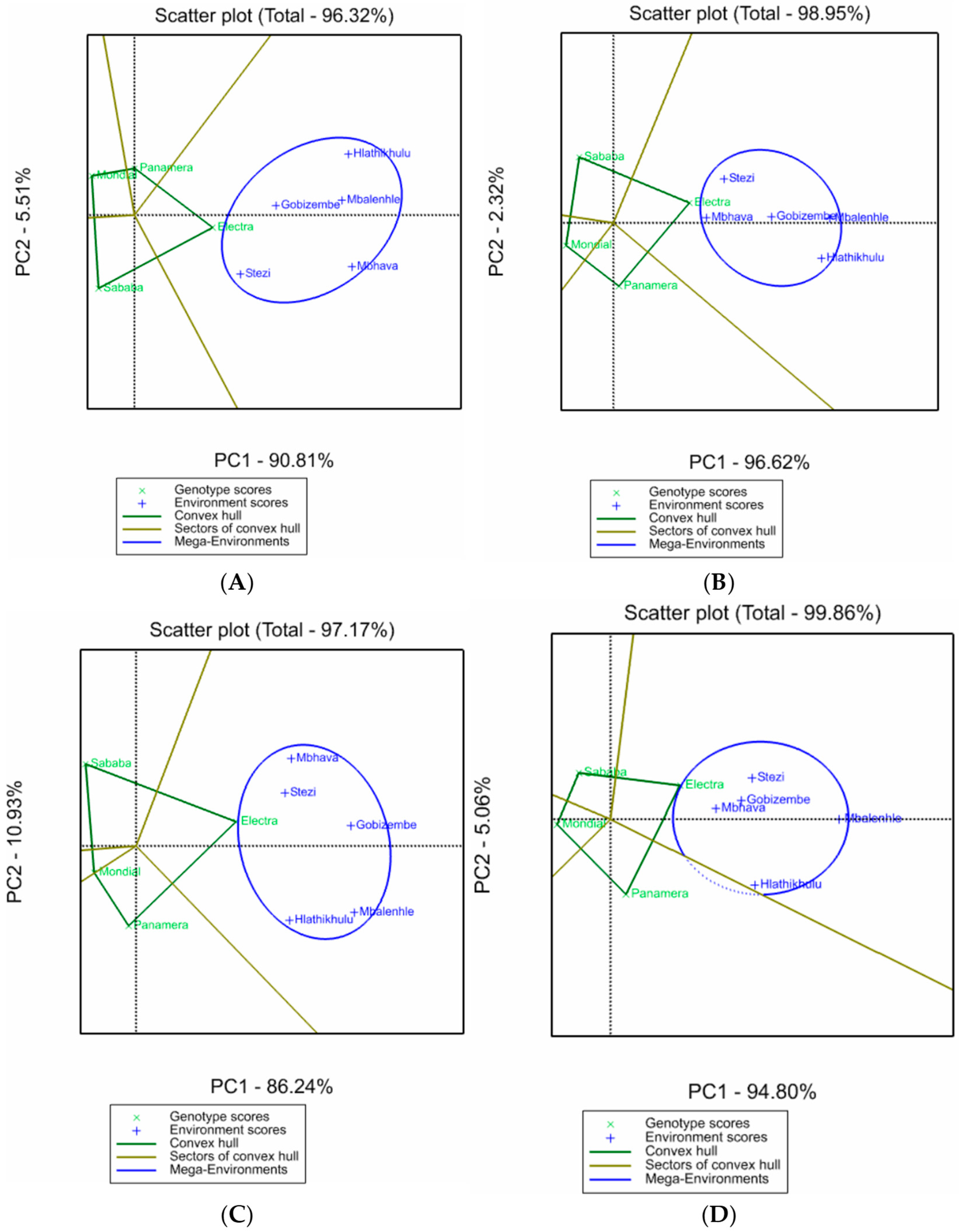 - Bilate, D.B.; Belew, Y.D.; Mulualem, B.T.; Gebreselassie, A.W. AMMI and GGE biplot analyses for mega environment identification and selection of some high-yielding cassava genotypes for multiple environments. Int. J. Agron. 2023, 1, 6759698. [Google Scholar] [CrossRef]