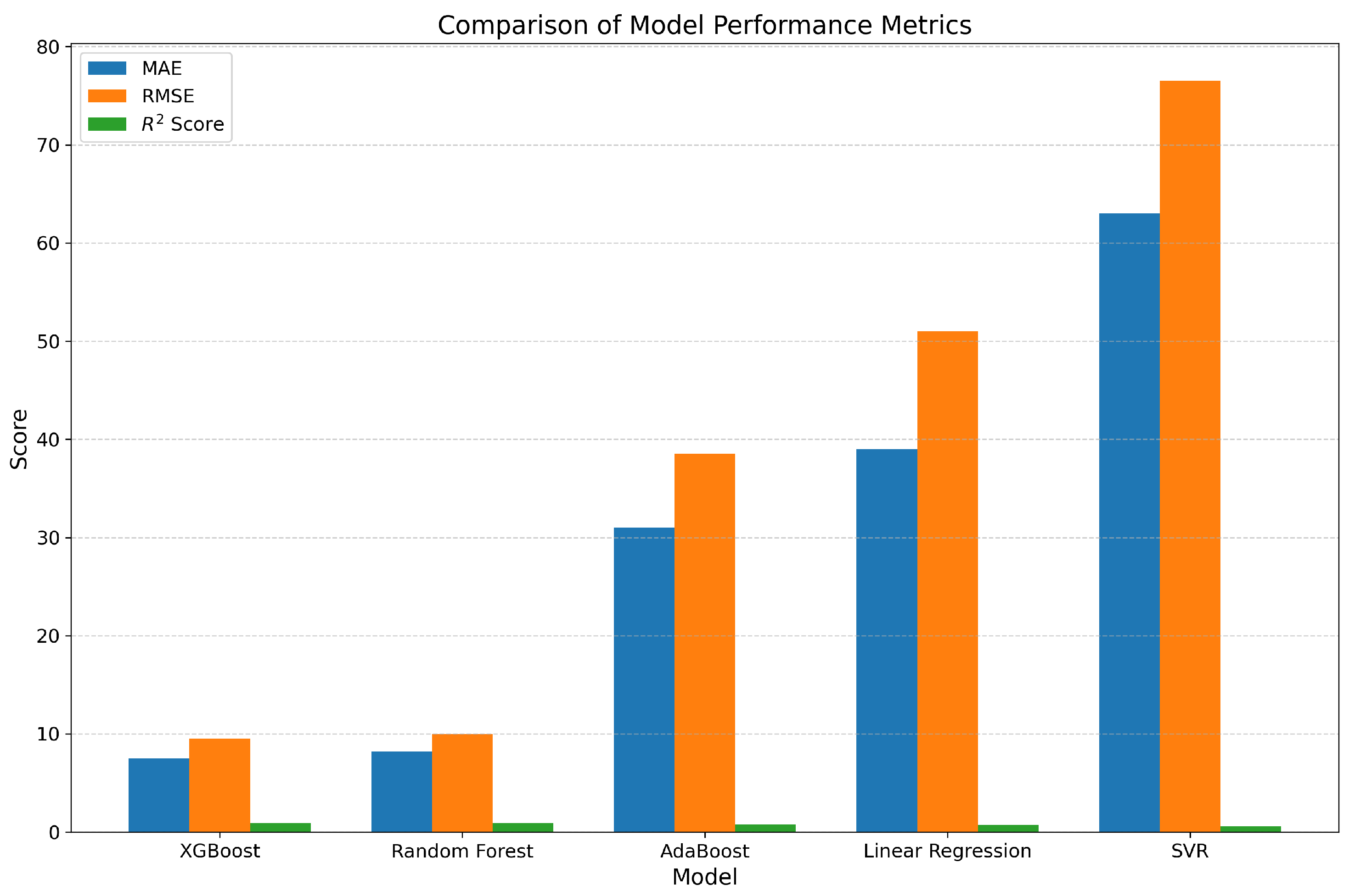 Out of the algorithms, XGBoost was the best performer with an R2 of 0.988 and low MAE (7.22), and RMSE (9.26) values were obtained as well. Random Forest performance was similar (MAE = 7.91, RMSE = 9.84, R2 = 0.986) but with higher error values than XGBoost, which could suggest it is less sensitive to interaction effects as compared with the other methods.