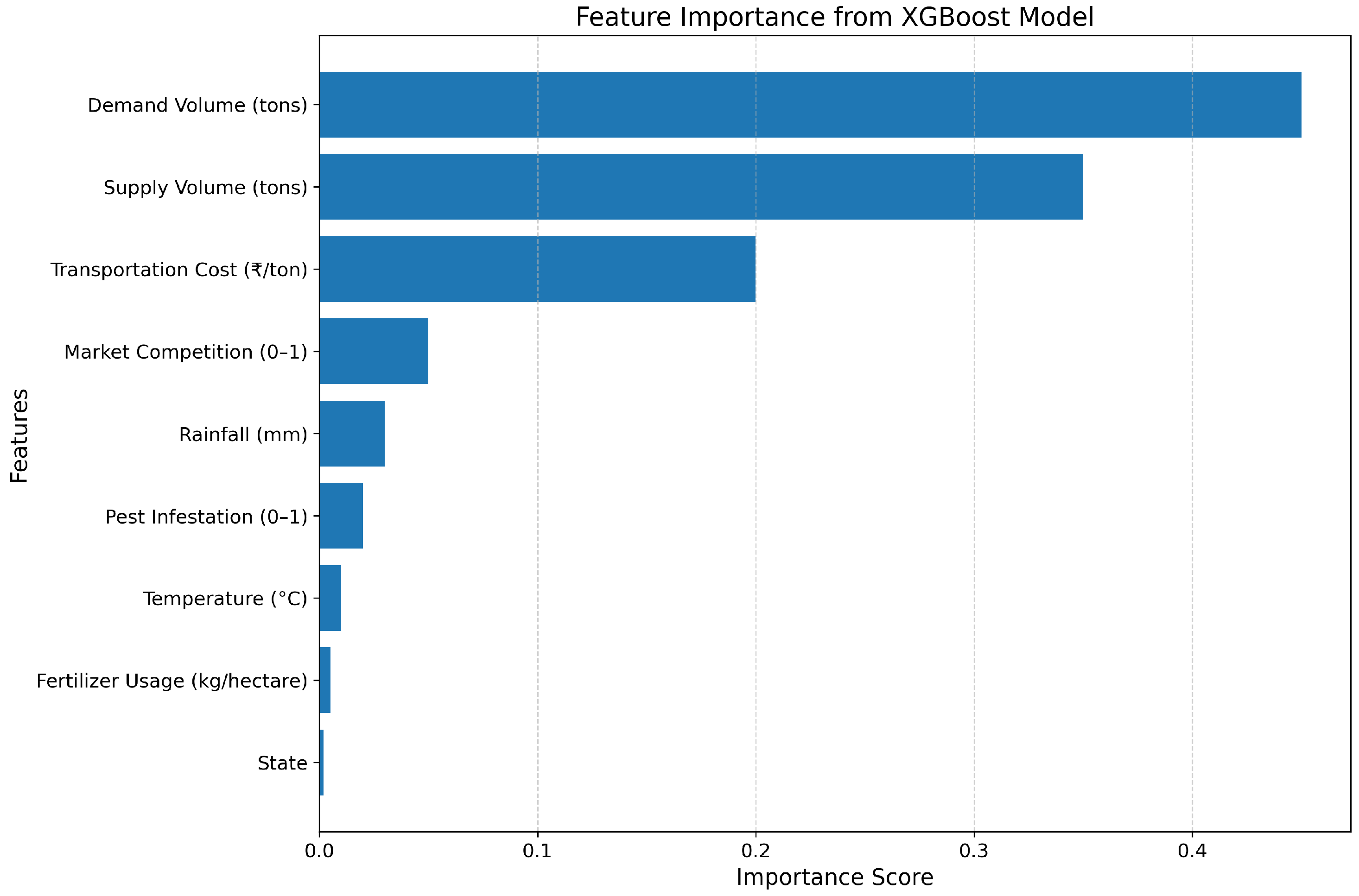 Figure 3, Feature Importance illustrates the feature importance as determined by the XGBoost model. The dominant predictors were demand volume, supply volume and transport cost, which collectively constituted the fundamental drivers of price variance. These observations are in line with market theory, which suggests that price discovery is heavily influenced by supply—demand considerations and transaction costs. XGBoost inherently captures nonlinear interactions, and feature interactions inaccessible to feature-importance metrics. As a result, the effect of environmental conditions on prices is implied by their contribution to the variation of the yield and supply dynamics, providing a domain-consistent interpretation.